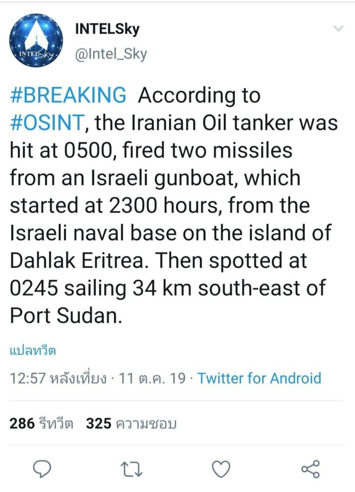 นอกจากนี้ยังมีรายงานจาก แอคเคานต์ twitter ที่มีชื่อว่า intelSky การโจมตีเรือขนน้ำมันของอิหร่านในช่วงเวลา 5:00 นในวันศุกร์ ที่มาจากขีปนาวุธ 2 ลูกจากเรือของอิสราเอล