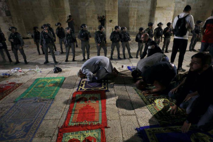 ชาวปาเลสไตน์และมุสลิมที่กำลังละหมาดบาดเจ็บจากการสลายการปฏิบัติศาสนศนกิจ (ละหมาด) เป็นจำนวนมาก หลายคนโดนทางการอิสราเอลจับกุม
