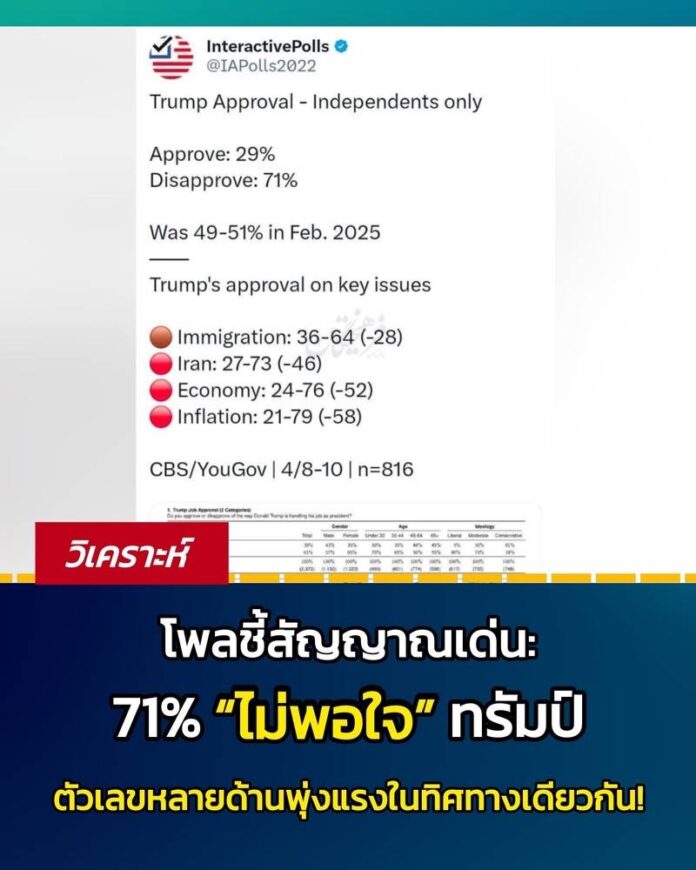 – ผลสำรวจล่าสุดจาก YouGov ที่เก็บข้อมูลจากประชาชนกลุ่มที่ไม่ระบุตัวตนทางการเมือง สะท้อนมุมมองของกลุ่มชาวอเมริกันผู้มีสิทธิเลือกตั้งที่ไม่ได้ผูกพันกับพรรคใดโดยตรง ซึ่งมักถูกมองว่าเป็นกลุ่มตัวชี้วัดทิศทางความรู้สึกสาธารณะที่สำคัญ