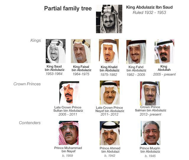 ในปี 2012 ซัลมาน บุตรของ อับดุลอาซิซ ได้รับการสถาปนาเป็นมกุฎราชกุมาร และสองปีหลังจากนั้น มุคริน บุตรของอัลดุลอาซิส ก็ได้รับแต่งตั้งให้เป็นรองมกุฎราชกุมาร