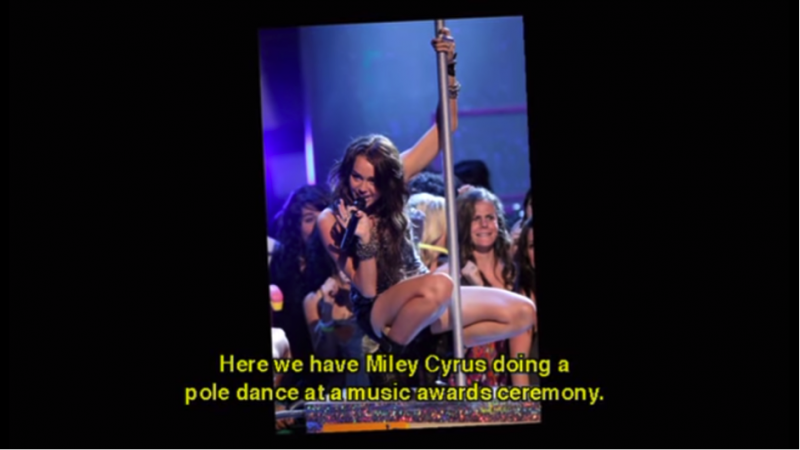 ในที่นี่เรามี ไมลี่ ไซรัส (Miley Cyrus) กำลังเต้นรูดเสา ในพิธีมอบรางวัล music awards ceremony