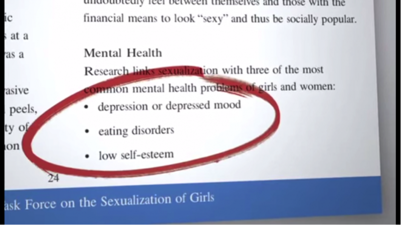 ในปี 2007 สมาคมนักจิตวิทยาอเมริกัน (American Psychological) เผยแพร่รายงาน ด้วยกับบทสรุปที่ว่า เด็กผู้หญิง ที่รับเห็นภาพที่มีการใช้ เพศเป็นเครื่องมือสื่อสารต่างๆ ตั้งแต่อายุยังน้อย มีแนวโน้มที่จะประสบกับ 3 ปัญหาสุขภาพจิต ที่เป็นกันมากในหมู่ เด็กผู้หญิง และสตรี คือ สภาวะซึมเศร้า, สภาวะการกินอาหารผิดปกติ และสภาวะการให้เกียรติตนเองน้อยเกินไป