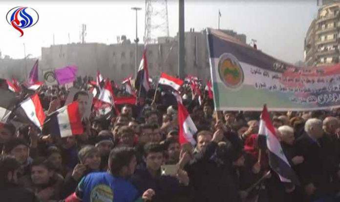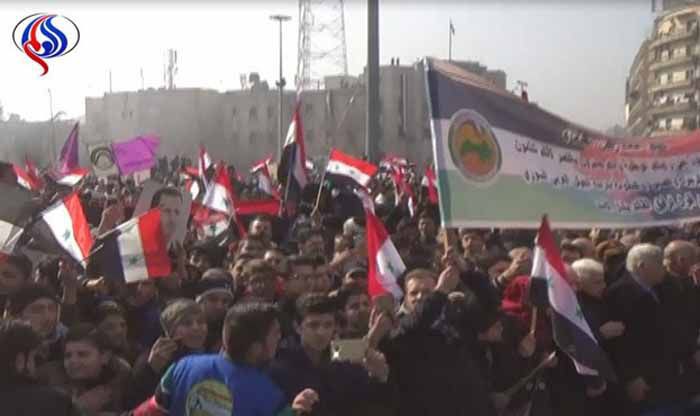 ประชาชนที่เข้าร่วมงานเฉลิมฉลองได้ร่วมกันแสดงความยินดีไปยังทหารซีเรียและพันธมิตรซีเรียที่สามารถปลดปล่อยอาเลปโปสำเร็จ